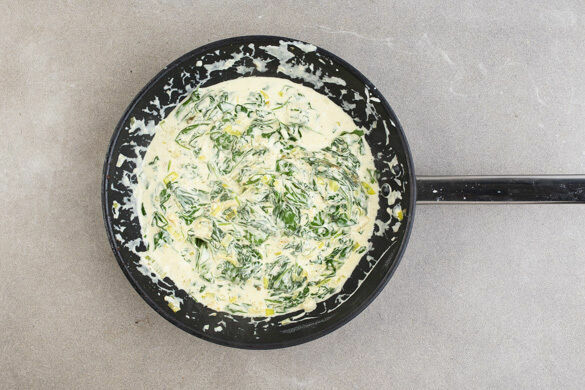 Den Lauch in derselben Pfanne mit 1 Prise Salz bei mittlerer Hitze 5–6Min. anbraten, dann die 1/2 des Lauchs in eine große Schüssel geben. Den Spinat, die Crème fraîche, die 1/2 des Brühgewürzes und 100ml Wasser in die Pfanne geben. Mit 1 Prise Pfeffer würzen, die Sauce ca. 3Min. köcheln lassen, dann die Petersilie und das Basilikum unterrühren.