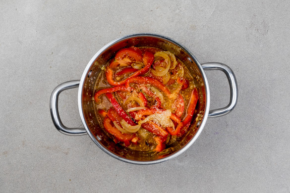Die Zwiebelstreifen in einem mittelgroßen Topf mit 1EL Pflanzenöl 1–2Min. anschwitzen. Den Knoblauch, die Tomaten und die Paprika hinzufügen und kurz mitbraten.