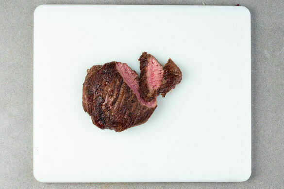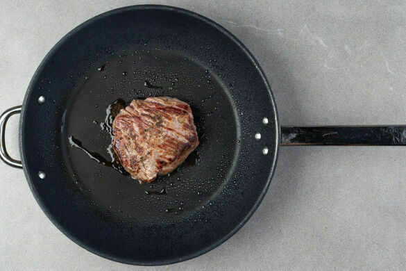 Das Fleisch trocken tupfen und in einer großen Pfanne mit 2EL Olivenöl bei starker Hitze auf jeder Seite 2–3Min. braten, abhängig davon, ob es medium oder eher durchgebraten sein soll. Aus der Pfanne nehmen und bis zum Servieren auf einem Teller abgedeckt ruhen lassen.