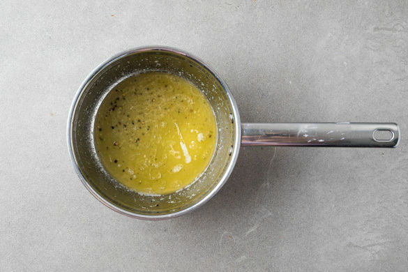 In einem kleinen Topf 2EL Butter bei niedriger Temperatur schmelzen lassen, dann vom Herd nehmen und 2EL hellen Essig, 1/2TL Salz und Pfeffer nach Geschmack unterrühren. Die Radieschen in dünne Scheiben schneiden.