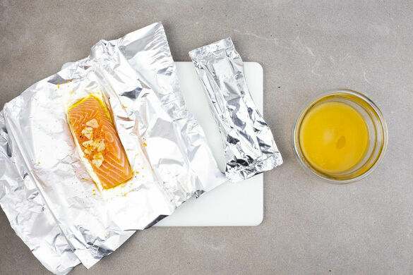 Die Orangenschale abreiben, dann die Orange halbieren und auspressen. Den Knoblauch schälen und in feine Scheibchen schneiden. Den Fisch jeweils auf ein Stück Alufolie legen. Mit insgesamt 1/2TL Olivenöl beträufeln und mit je 1 Prise Salz und Pfeffer würzen. Die Orangenschale und den Knoblauch über den Fisch streuen und die Alufolie zu luftdichten Paketen falten.