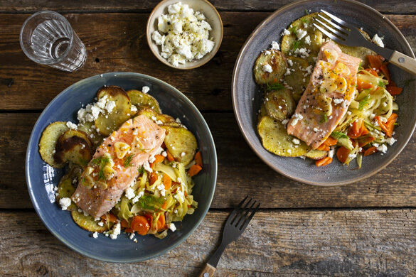 Lachs mit Orange und Feta auf Kartoffeln und Fenchel-Karotten-Gemüse