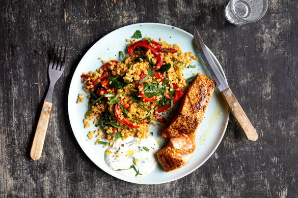 Gebackener Lachs mit Joghurt und Paprika-Spinat-Bulgur