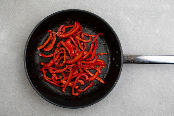 Die Paprika vierteln, entkernen und in dünne Streifen schneiden. In einer großen Pfanne mit 1EL Olivenöl bei mittlerer Hitze 3–5Min. braten. Die restliche Gewürzmischung dazugeben und weitere 2Min. braten.