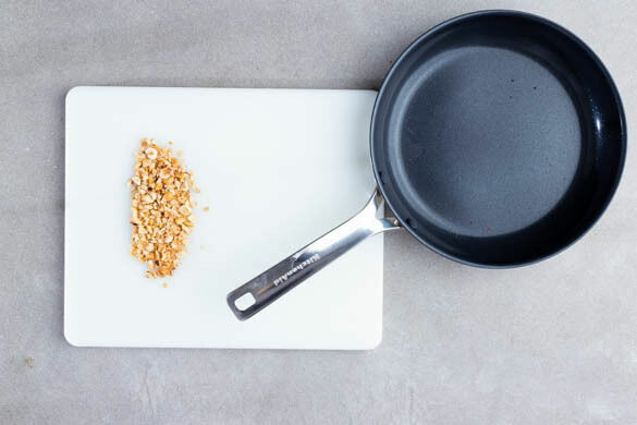 Die Haselnüsse in einer mittelgroßen Pfanne ohne Zugabe von Fett bei mittlerer Hitze 1–2Min. goldbraun anrösten. Vorsicht, sie können schnell zu dunkel werden. Zum Abkühlen aus der Pfanne nehmen, grob hacken und beiseitestellen. Die Pfanne aufbewahren.