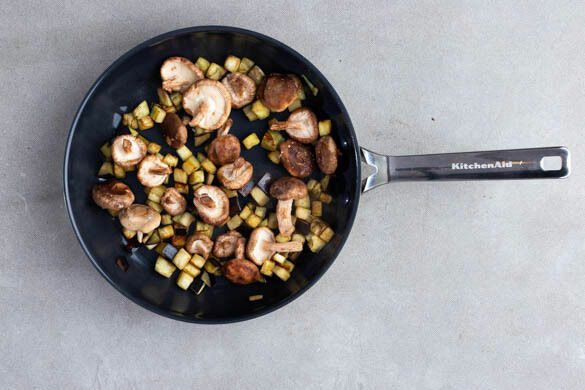 Die Aubergine in 1–2cm große Würfel schneiden und in einer mittelgroßen Pfanne mit 1EL Pflanzenöl bei mittlerer bis starker Hitze 5–7Min. anbraten. Tipp: Einen Deckel aufsetzen, so werden die Auberginen schön weich.