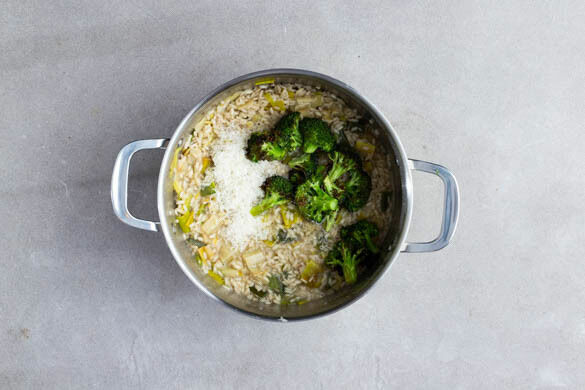 ⅔ des Käses in das Risotto rühren und den Brokkoli unterheben. Den Topf vom Herd nehmen, das Risotto mit dem Zitronensaft verfeinern und mit Salz und Pfeffer abschmecken. Das Lauchrisotto auf Teller verteilen und die Eier darauf anrichten. Mit den Peperonistreifen, dem restlichen Käse und dem Sauerampfer nach Belieben garnieren und servieren.