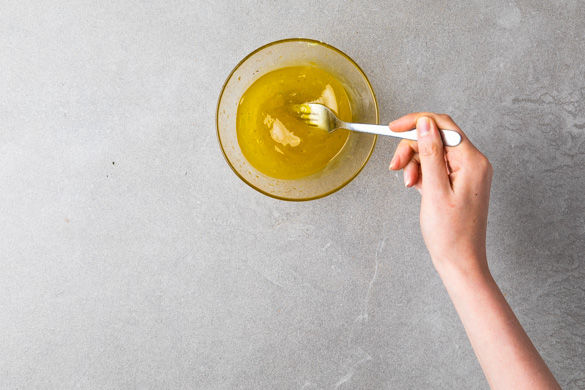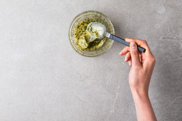Für das Dressing den Senf mit 2EL Essig, 1-2TL der Gewürzmischung, 1TL Salz und etwas Pfeffer verrühren, bis das Salz sich aufgelöst hat. Dann 2-3EL Olivenöl unterrühren.