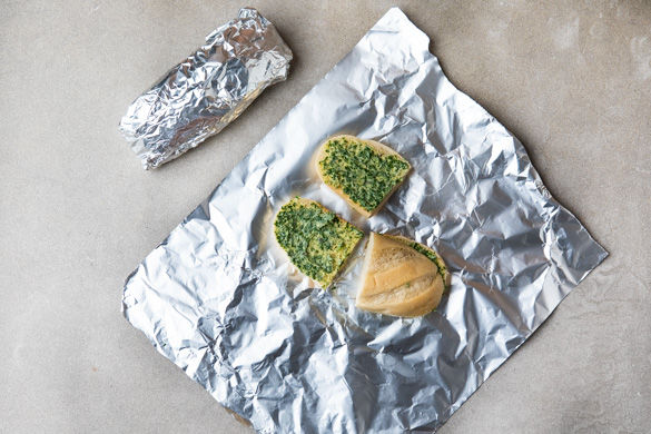 Die Baguettebrötchen der Länge nach einschneiden, aber nicht durchschneiden, dann wie ein Buch aufklappen und die Innenseiten mit der Kräuterbutter bestreichen. Die Brote wieder zusammenklappen und in Alufolie einwickeln.