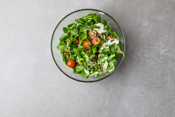 Die Tomaten je nach Größe vierteln oder achteln. Die Lauchzwiebel putzen und in feine Ringe schneiden. Tomaten und Lauchzwiebeln mit dem Feldsalat vermengen und bis zum Servieren beiseitestellen. Evtl. kühlen, falls es draußen sehr warm ist.