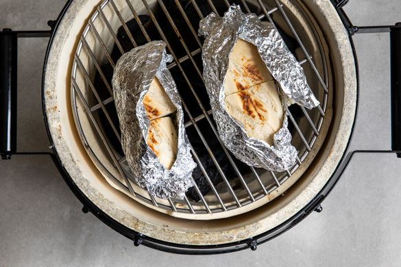 Die Brote auf den Grill legen und etwa 10Min. grillen, bis die Außenseite knusprig und das Innere warm ist. Vom Grill nehmen und kurz abkühlen lassen. Vorsichtig öffnen (Vorsicht vor dem Dampf!), in Scheiben schneiden und zu dem Grillgut und den Beilagen servieren. Den Salat erst kurz vor dem Servieren mit dem Dressing vermengen.