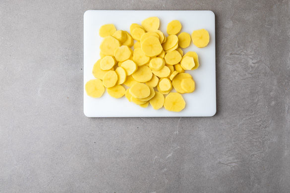 In einem großen Topf ausreichend leicht gesalzenes Wasser für die Kartoffeln zum Kochen bringen. Die Kartoffeln in ca. 5mm dicke Scheiben schneiden. und in ca. 10-12Min. gar, aber nicht zu weich kochen. Die Kartoffeln in ein Sieb abgießen und mit kaltem Wasser abschrecken.