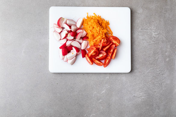 Währenddessen die Radieschen putzen und vierteln. Die Karotten schälen und grob raspeln. Die Tomaten achteln. Den Kerbel und den Dill ohne die harten Stängel fein schneiden. Den Schnittlauch in kleine Röllchen schneiden.