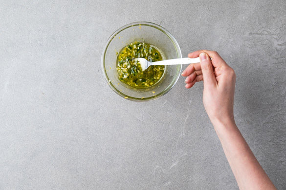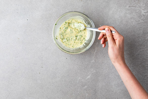 Den Knoblauch schälen und fein hacken. Die Oreganoblätter von den Stängeln streifen, dann die Hälfte fein hacken. Die Schale der übrigen 1/2 Zitrone (siehe Schnittlauchdip-Rezept auf der anderen Rezeptkarte) abreiben und den Saft auspressen. Knoblauch, gehackten Oregano, Zitronenschale und 1-2EL Saft mit 2EL Olivenöl, 1/2TL Salz und Pfeffer verrühren.