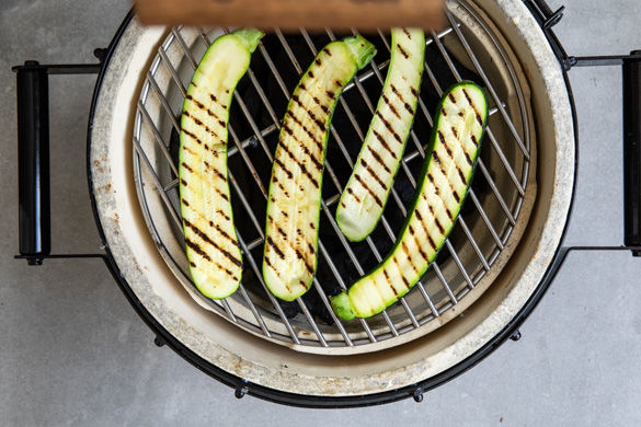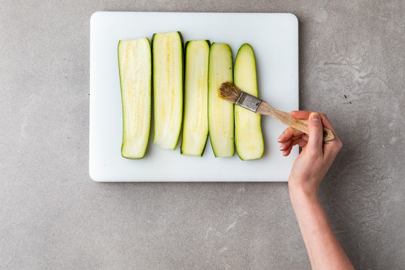 Die Zucchini der Länge nach in 1cm dicke Scheiben schneiden. Die Schnittflächen mit etwas Kräuteröl bepinseln. Die Scheiben von jeder Seite ca. 4-5Min. grillen, bis die Zucchini gar, aber noch bissfest sind und schöne Grillstreifen haben.