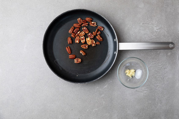 Den Grill vorheizen. Die Pekannüsse in einer mittelgroßen Pfanne auf mittlerer Hitze ca. 2-3Min. anrösten. Vorsicht! Sie werden schnell zu dunkel. Zum Abkühlen aus der Pfanne nehmen, sie dunkeln sonst noch nach, und beiseitestellen. Den Knoblauch schälen und fein hacken.