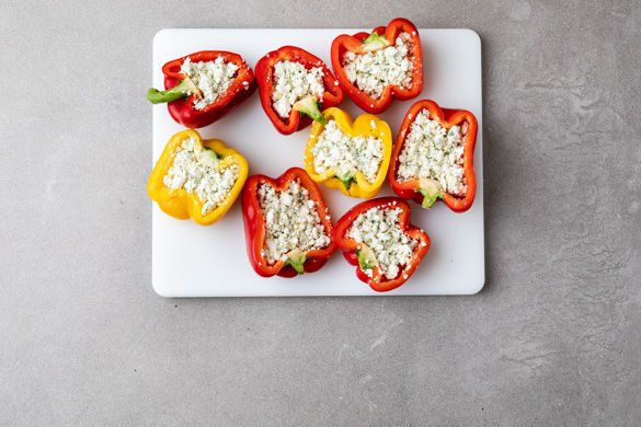 Die Paprika längs halbieren und entkernen. Die Estragonblätter abzupfen und fein hacken. Den Feta mit den Händen zerkrümeln und mit der Hälfte des Knoblauchs und 3/4 des Estragons mischen. Die Paprika mit der Feta-Estragon-Mischung füllen.