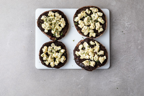 Die Pilzstiele vorsichtig entfernen, sodass kleine Schalen entstehen. Die Thymianblättchen abstreifen. Den Camembert in kleine Würfel schneiden, mit dem übrigen Knoblauch mischen und die Pilze damit füllen. Den Thymian auf dem Käse verteilen.