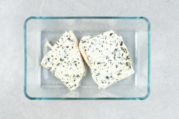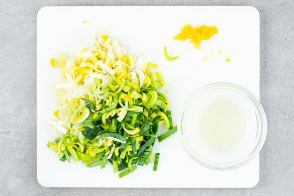 Den Backofen mit Grillfunktion oder Ober-/Unterhitze auf 250°C vorheizen. In einem mittelgroßen Topf ausreichend gesalzenes Wasser für die Kartoffeln zum Kochen bringen. Den Lauch längs halbieren und in ca. 0,5cm dünne Streifen schneiden. Die Zitronenschale abreiben, dann die Zitrone halbieren und auspressen.
