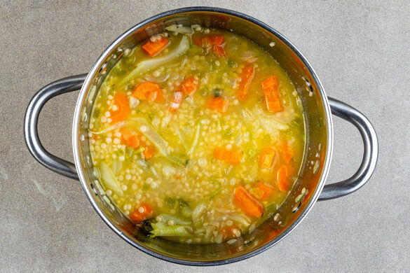 Das kochende Wasser in den Topf gießen, dann die ½ des Brühgewürzes und den Perlencouscous einrühren. Den Eintopf aufkochen und abgedeckt bei mittlerer Hitze ca. 10Min. sanft köcheln lassen.