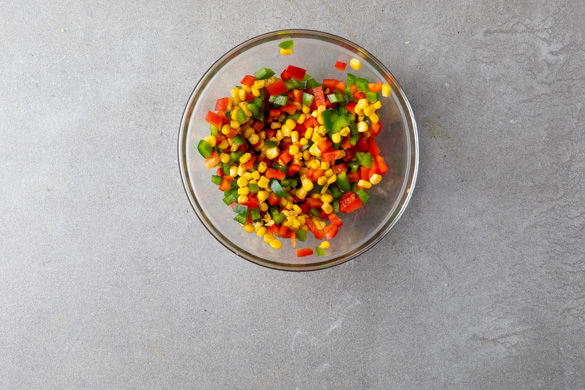 Die Paprika halbieren, entkernen und in kleine Würfel schneiden. Zum Mais in die große Schüssel geben.