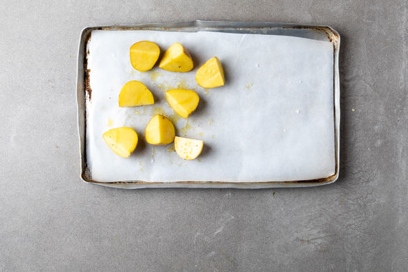 Die Kartoffeln je nach Größe halbieren oder vierteln, mit 2–3EL Olivenöl sowie etwas Salz und Pfeffer vermengen und auf einem mit Backpapier ausgelegten Backblech verteilen, dabei ca. die Hälfte des Bleches frei lassen. Im Ofen ca. 15–20Min. goldbraun backen.