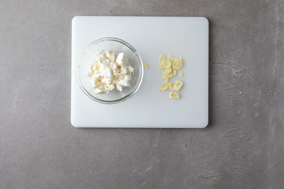 Den Knoblauch schälen und fein hacken. Den Käse mit den Fingern in kleine Stücke zerkrümeln.