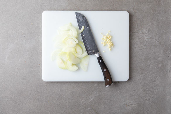 Den Backofen auf 180°C Umluft oder 200°C Ober-/Unterhitze vorheizen. Die Zwiebel halbieren und in feine Streifen schneiden. Den Knoblauch schälen und fein hacken.