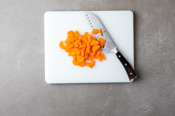 Die Karotten schälen, halbieren und in ca. 0,5cm dünne Scheiben schneiden.