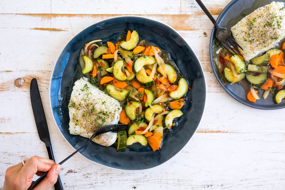 Wer Schmorgurken bislang zu langweilig fand, hat es noch nicht mit unserer asiatisch angehauchten Version probiert! Wir spendieren den Gurken noch Karotten, Zwiebeln, Knoblauch und süß-scharfe Chilisauce als Begleiter und servieren das Schmorgurkengemüse zu zarten Kabeljaufilets aus dem Ofen. Wenn Oma das gewusst hätte!