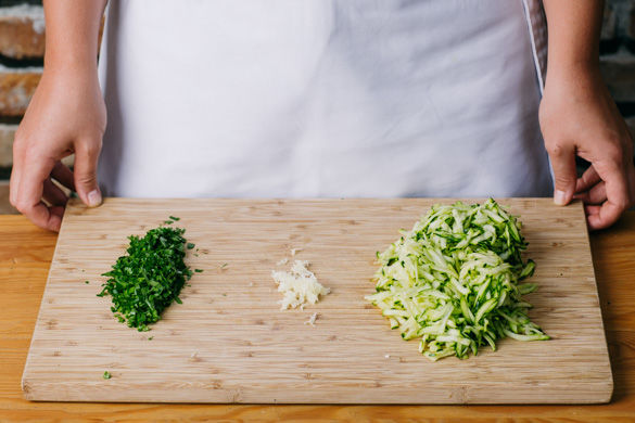 In einem großen Topf ausreichend leicht gesalzenes Wasser für die Pasta zum Kochen bringen. Die Zucchini auf einer Küchenreibe grob raspeln. Den Knoblauch schälen und fein hacken. Die Petersilienblätter von den Stängeln zupfen und fein hacken.