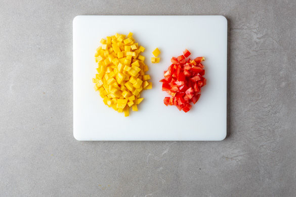 Die Mango würfeln. Dafür die langen Seiten der Mango dicht am Kern abschneiden. Das Fruchtfleisch innerhalb der beiden Hälften kreuzartig einschneiden und die Hälften nach außen stülpen. Die entstandenen Mangowürfel entlang der Schale abschneiden. Die Tomaten in ca. 1–2cm kleine Würfel schneiden.
