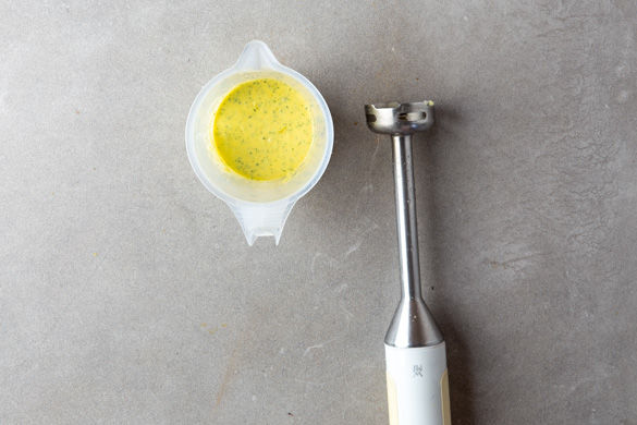 Die Limette halbieren, eine Hälfte auspressen, die zweite Hälfte in Spalten schneiden. Die Minzeblätter von den Stängeln zupfen und fein hacken. Die Hälfte der Mangowürfel mit dem gekochten Knoblauch, dem Limettensaft, der Hälfte der Minze, 1TL Olivenöl, Salz, Pfeffer und 1 Prise Zucker mit einem Stabmixer in einem hohen Gefäß pürieren.