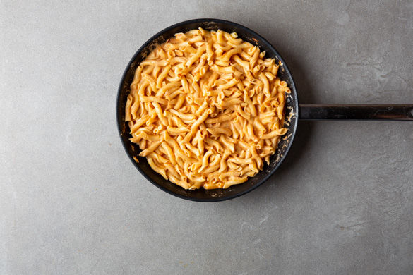 Die Pasta mit der Sauce und dem restlichen Frischkäse gut verrühren. Mit Salz und Pfeffer abschmecken.