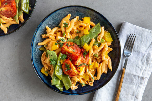 Das Rösten von Gemüse im Ofen ist eine unserer liebsten Gartechniken, denn so entwickeln sich bei vielen Sorten wunderbare Aromen und der Eigengeschmack der Gemüse kommt so richtig gut zur Geltung. Die breiten Bohnen, Paprika und Tomaten bilden hier keine Ausnahme und werden mit einer cremigen Sauce aus Frischkäse und getrockneten Tomaten zur Pasta serviert. Buon appetito!