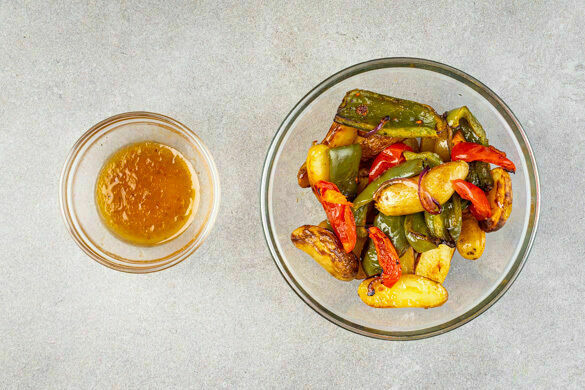 Das Fleisch zwischen dem Gemüse platzieren und alles 25–30Min. im Ofen backen, bis das Fleisch gar und appetitlich gebräunt ist. Nach der Hälfte der Zeit die Position der Bleche tauschen.