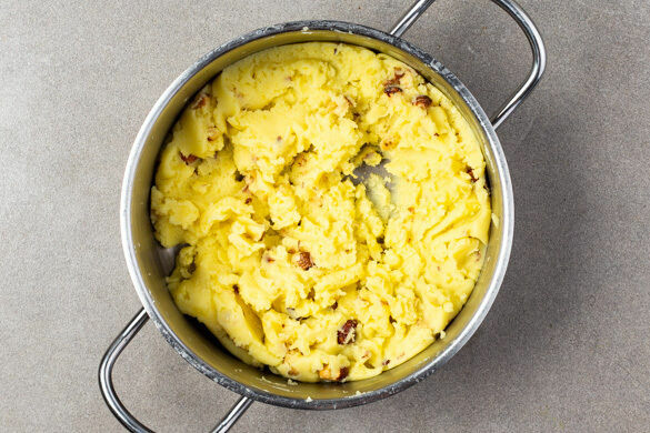 In einem großen Topf ausreichend gesalzenes Wasser für die Kartoffeln zum Kochen bringen. Die Kartoffeln schälen und je nach Größe halbieren oder vierteln. In das kochende Wasser geben und in ca. 15Min. bissfest kochen. Mit einer Tasse etwas Kochwasser abschöpfen, dann die Kartoffeln in ein Sieb abgießen. Zurück in den Topf geben und abgedeckt warm halten.