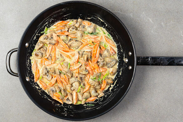 Die Pilze in der Pfanne mit 2EL Olivenöl bei starker Hitze 2–3Min. braten. Die Karotten und die Lauchzwiebeln zugeben und 1–2Min. mitbraten. Mit 100ml Wasser ablöschen und 2–3Min. garen, bis das Wasser fast verdampft ist und die Karotten bissfest sind. 3/4 der Crème fraîche unterrühren und mit dem Bratkartoffelgewürz sowie Salz und Pfeffer abschmecken.