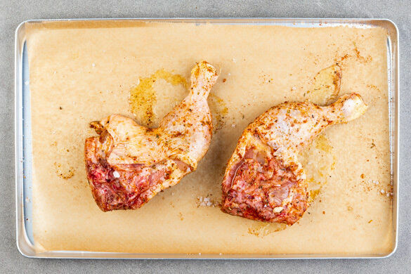 Den Backofen auf 250°C (230°C Umluft) vorheizen. 1–2EL Olivenöl mit der 1/2 des Bratkartoffelgewürzes und je 1 Prise Salz und Pfeffer verrühren. Die Hähnchenschenkel trocken tupfen und mit dem Würzöl einreiben. Wenn der Ofen heiß ist, mit der Haut nach unten auf einem mit Backpapier ausgelegten Backblech 30–35Min. backen, bis das Fleisch durch ist. Nach der Hälfte der Zeit wenden.