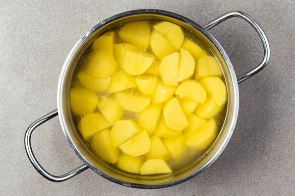 In einem mittelgroßen Topf ausreichend gesalzenes Wasser für die Kartoffeln zum Kochen bringen. Die Kartoffeln schälen und je nach Größe halbieren oder vierteln. In das kochende Wasser geben und in ca. 15Min. bissfest kochen. Mit einer Tasse etwas Kochwasser abschöpfen, dann die Kartoffeln in ein Sieb abgießen. Zurück in den Topf geben und abgedeckt warm halten.