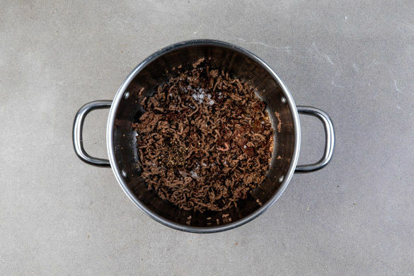 Das Hackfleisch in einem großen Topf mit 2EL Olivenöl bei starker Hitze 3–4Min. anbraten. Mit Salz und Pfeffer würzen.