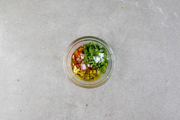 Die Limettenschale abreiben, dann die Limetten halbieren und auspressen. Die Chilischote längs halbieren, ggf. für weniger Schärfe entkernen und in möglichst feine Streifen schneiden. Den Koriander samt Stängeln fein schneiden.