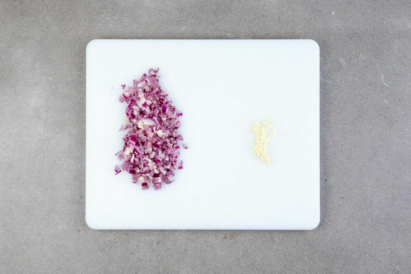 Den Backofen auf 220°C (200°C Umluft) vorheizen. Die Zwiebeln schälen, halbieren und in feine Würfel schneiden. Den Knoblauch schälen und ebenfalls fein würfeln.