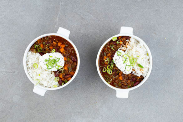 Einst der Klassiker auf WG-Partys, bevorzugt serviert weit nach Mitternacht, wundern wir uns heute, warum wir das wunderbare Chili con Carne nicht öfter mal auch einfach so zubereitet haben. Der Eintopf aus Rinderhack, das in einer herzhaften Bohnen-Tomaten-Sauce mit viel frischem Gemüse köchelt und dann mit Crème fraîche und Lauchzwiebeln zu lockerem Basmatireis serviert wird, ist nämlich ein echter Glücklichmacher!
