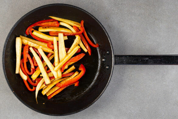 Die Pastinaken und die ½ der Paprika in einer mittelgroßen Pfanne mit 1EL Olivenöl und 1/2TL Salz bei mittlerer Hitze abgedeckt ca. 8Min. weich garen, dabei gelegentlich umrühren. Den Deckel entfernen und das Gemüse ca. 2Min. goldbraun braten.
