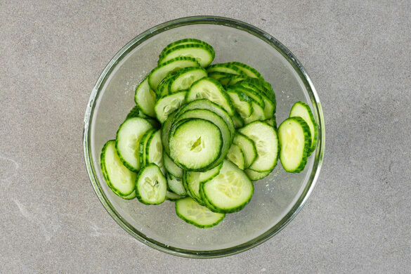 Die Zitronenschale abreiben, dann die Zitrone halbieren und auspressen. Die Gurke in dünne Scheiben schneiden und mit 2EL Zitronensaft, 1TL Honig und ½TL Salz vermengen.