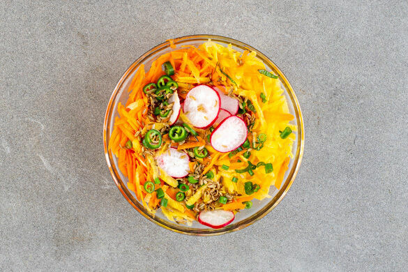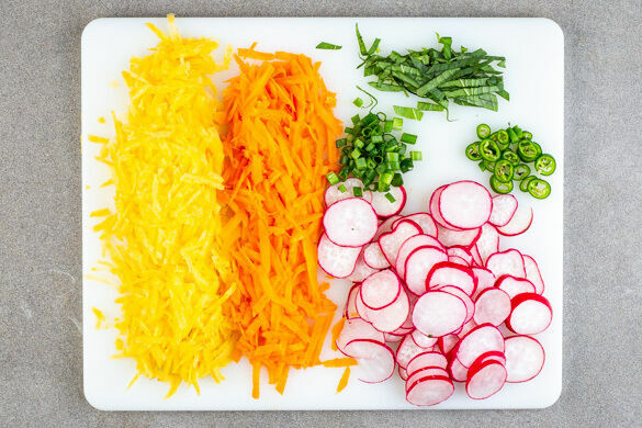 Den Backofen auf 240°C (220°C Umluft) vorheizen. Die Karotten ggf. schälen und mit einer Küchenreibe grob raspeln. Die Radieschen in dünne Scheiben schneiden. Die Peperoni in feine Ringe schneiden. Tipp: Für weniger Schärfe die Kerne entfernen. Die Lauchzwiebeln ebenfalls in feine Ringe schneiden. Die Thai-Basilikumblätter abzupfen und fein schneiden.