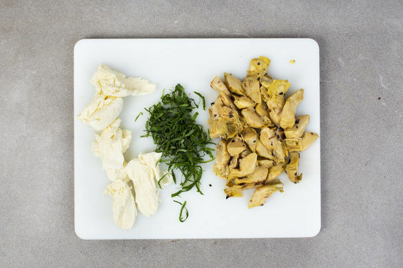 Den Mozzarella in Scheiben schneiden oder mit den Fingern grob zerzupfen. Die Basilikumblätter von den Stängeln zupfen und in feine Streifen schneiden. Die Artischocken in einem Sieb abtropfen lassen und grob schneiden.