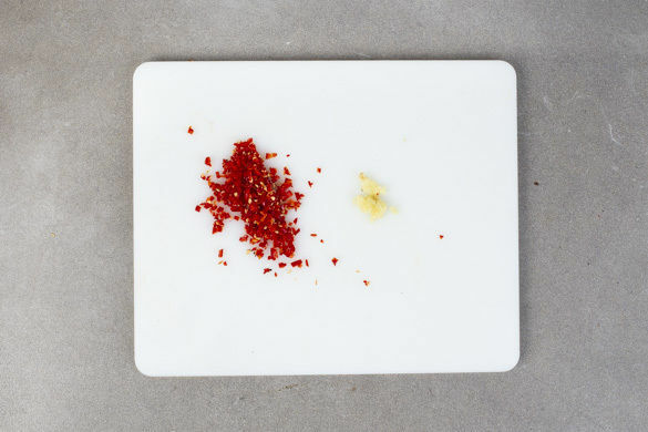 In einem großen Topf ausreichend gesalzenes Wasser für die Pasta zum Kochen bringen. Die Peperoni längs halbieren und in feine Würfel schneiden. Tipp: Für weniger Schärfe die Kerne entfernen. Den Knoblauch schälen und ebenfalls fein würfeln.