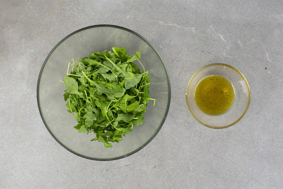 Den Rucola ggf. verlesen. Aus 1EL Olivenöl, 2TL Essig sowie je 1 kräftigen Prise Salz und Pfeffer ein Dressing anrühren.